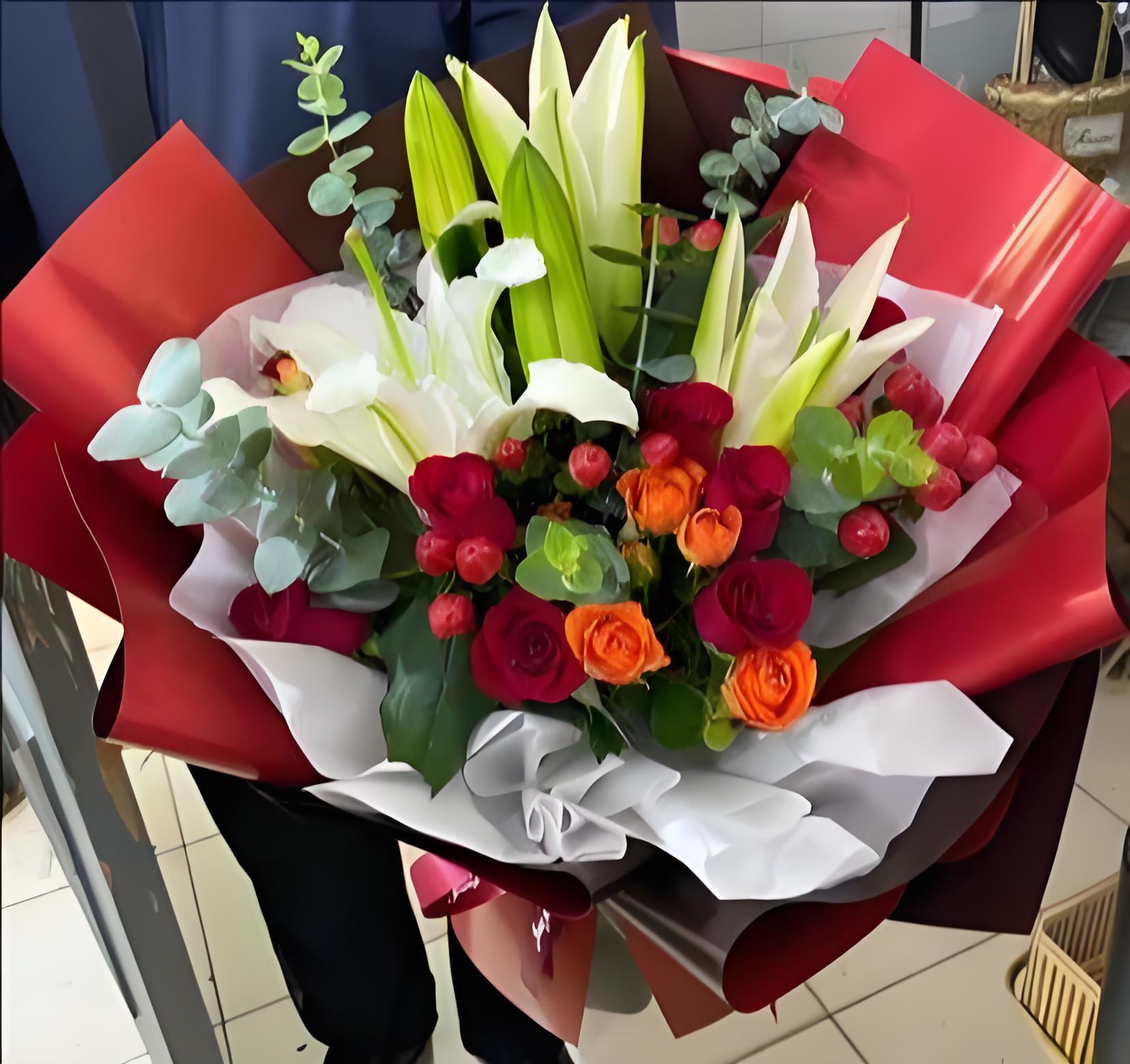 临洮县花店包11枝红玫瑰、2枝多头白百合、6枝橙色多头玫瑰、红豆、尤加利叶